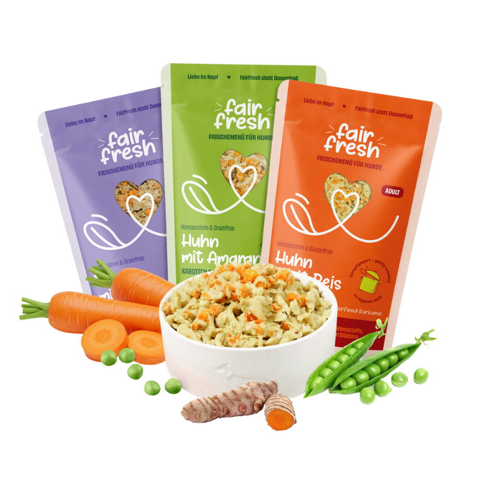Die FAiRFRESH Komplettmenüs sind der Gamechanger für deinen Napf! Schluss mit langweiligem Hundefutter: Damit machst du jede Mahlzeit im Handumdrehen zum krassen Geschmackserlebnis – und das ganz ohne Getreide, Gluten, Aromastoffe oder Geschmacksverstärker.