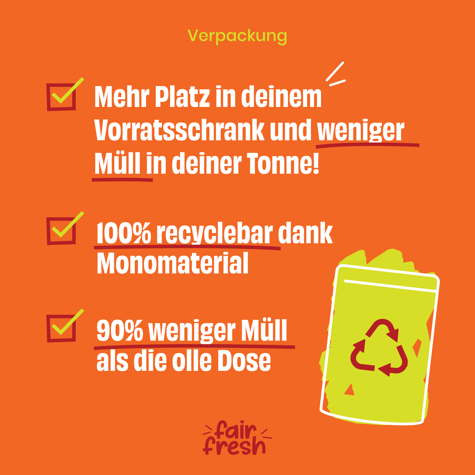 Dank unseren praktischen, voll recyclingfähigen Monomaterialbeuteln tust du nicht nur etwas für die Umwelt, du musst auch weniger schleppen und spart ordentlich Platz im Schrank ein! Anders als bei Verbundmaterial entsteht hier bis zu 90% weniger Müll.