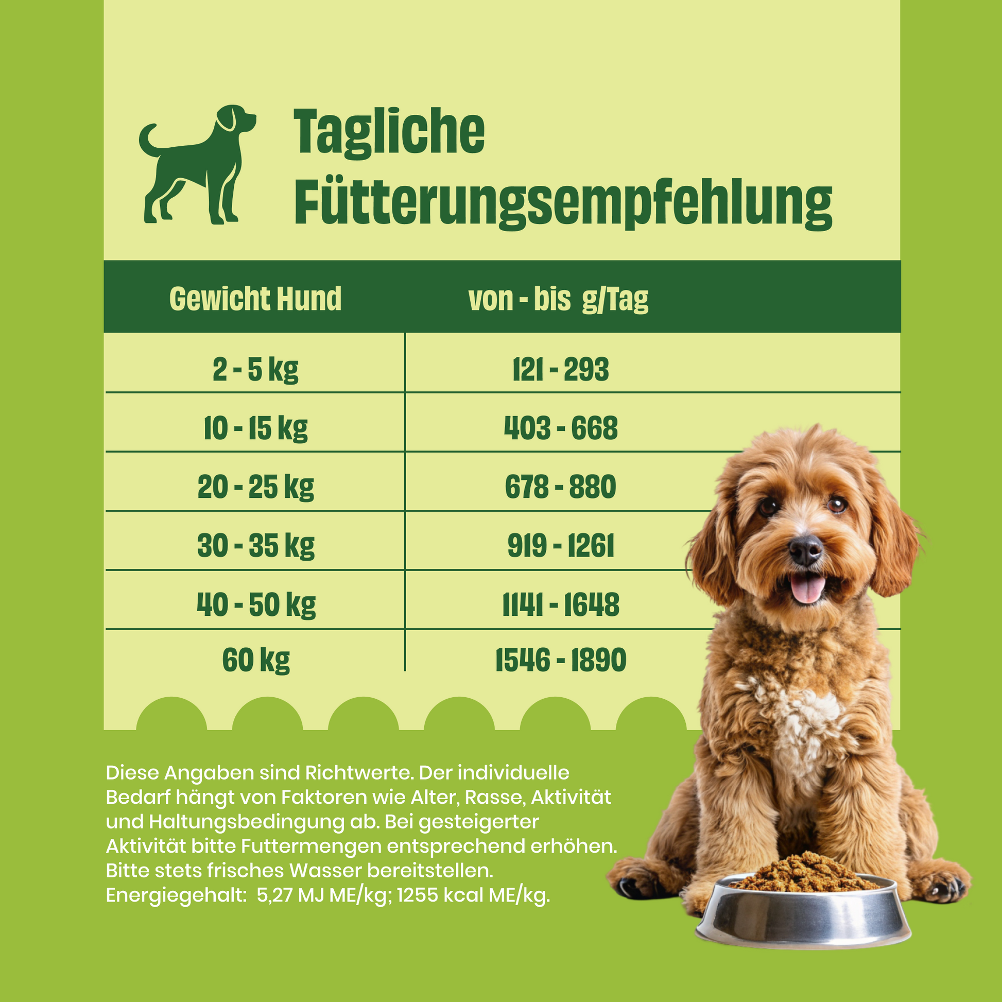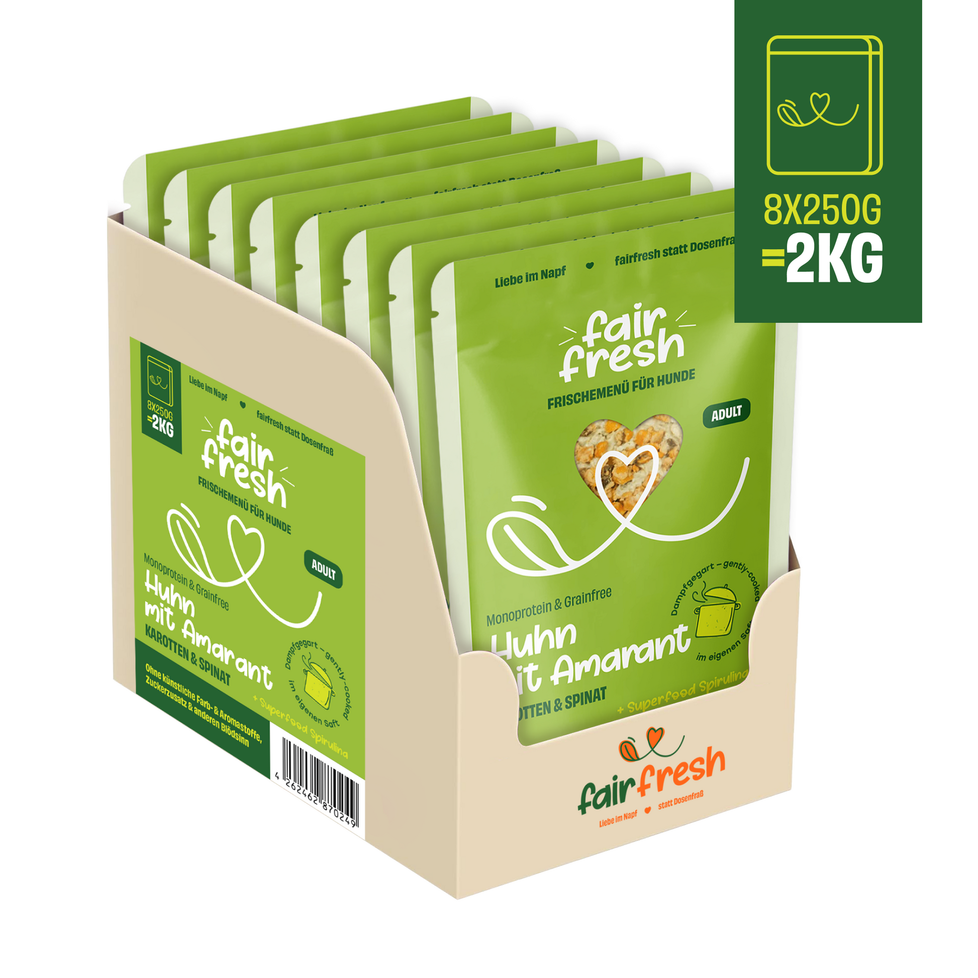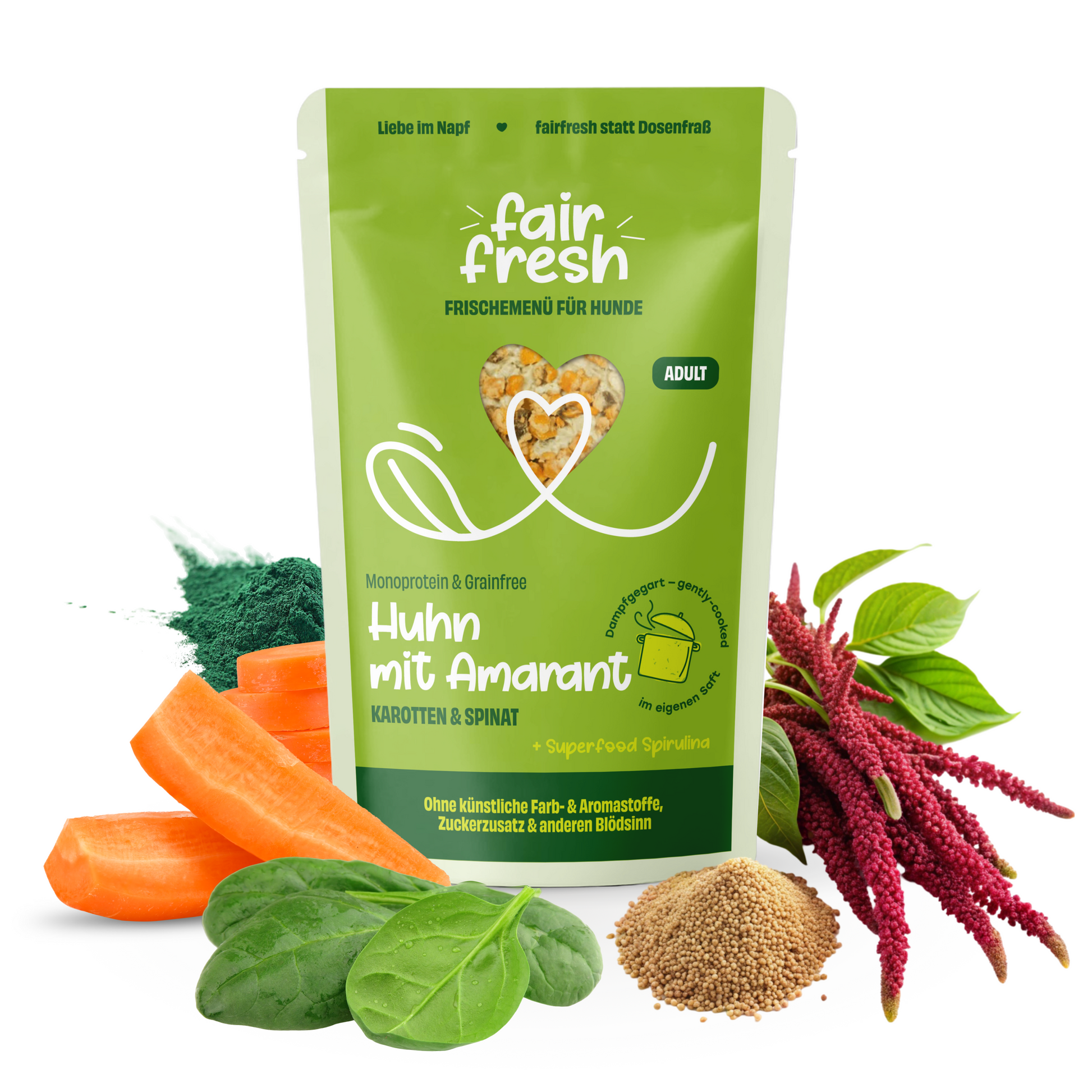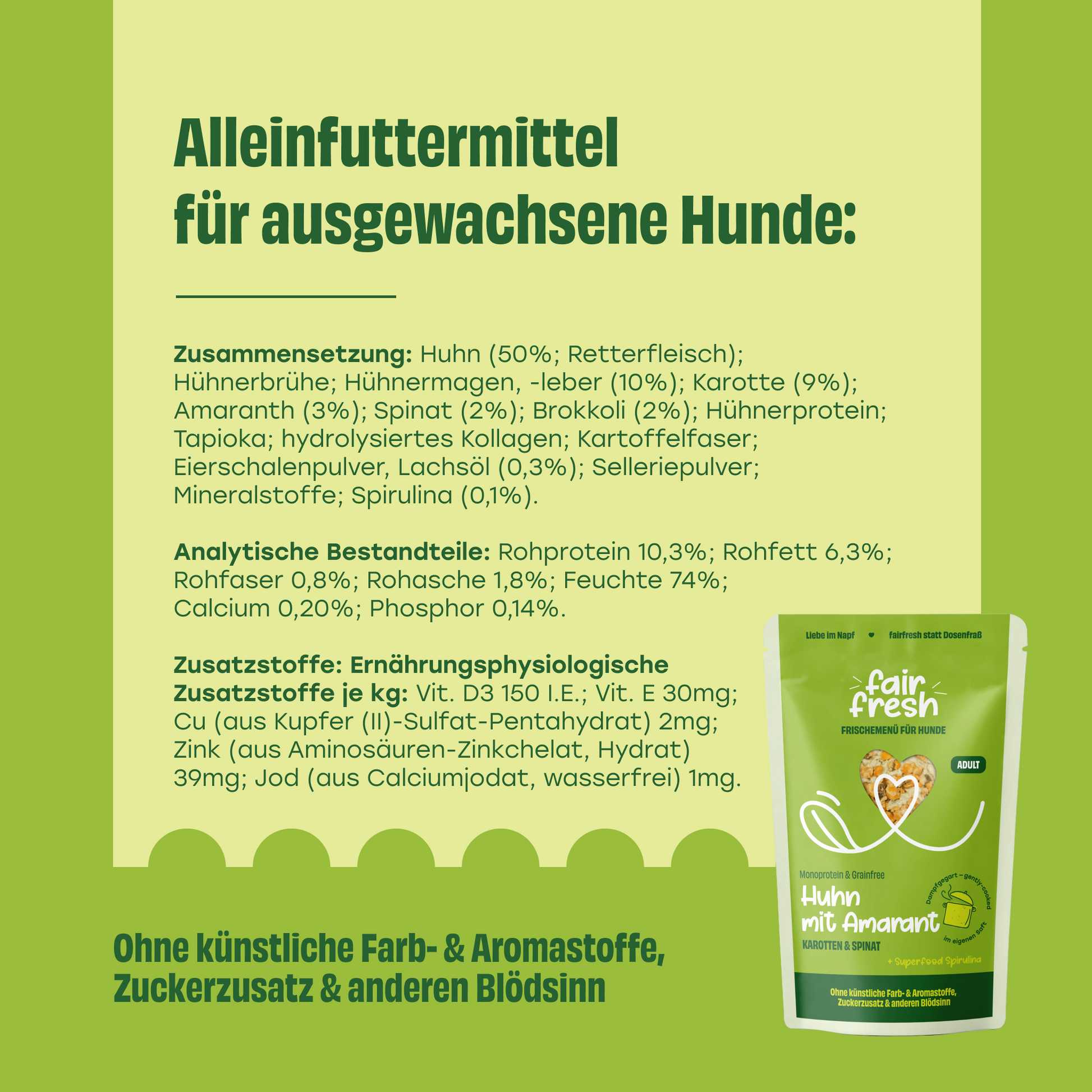 Das phänomenal leckere Komplettmenü ist aus Hühner-Retterfleisch, knackiger Karotte, gesundem Spinat und Brokkoli. Schonend dampfgegart und somit vollgepackt mit allen natürlichen Nährstoffen die dein Hund braucht.