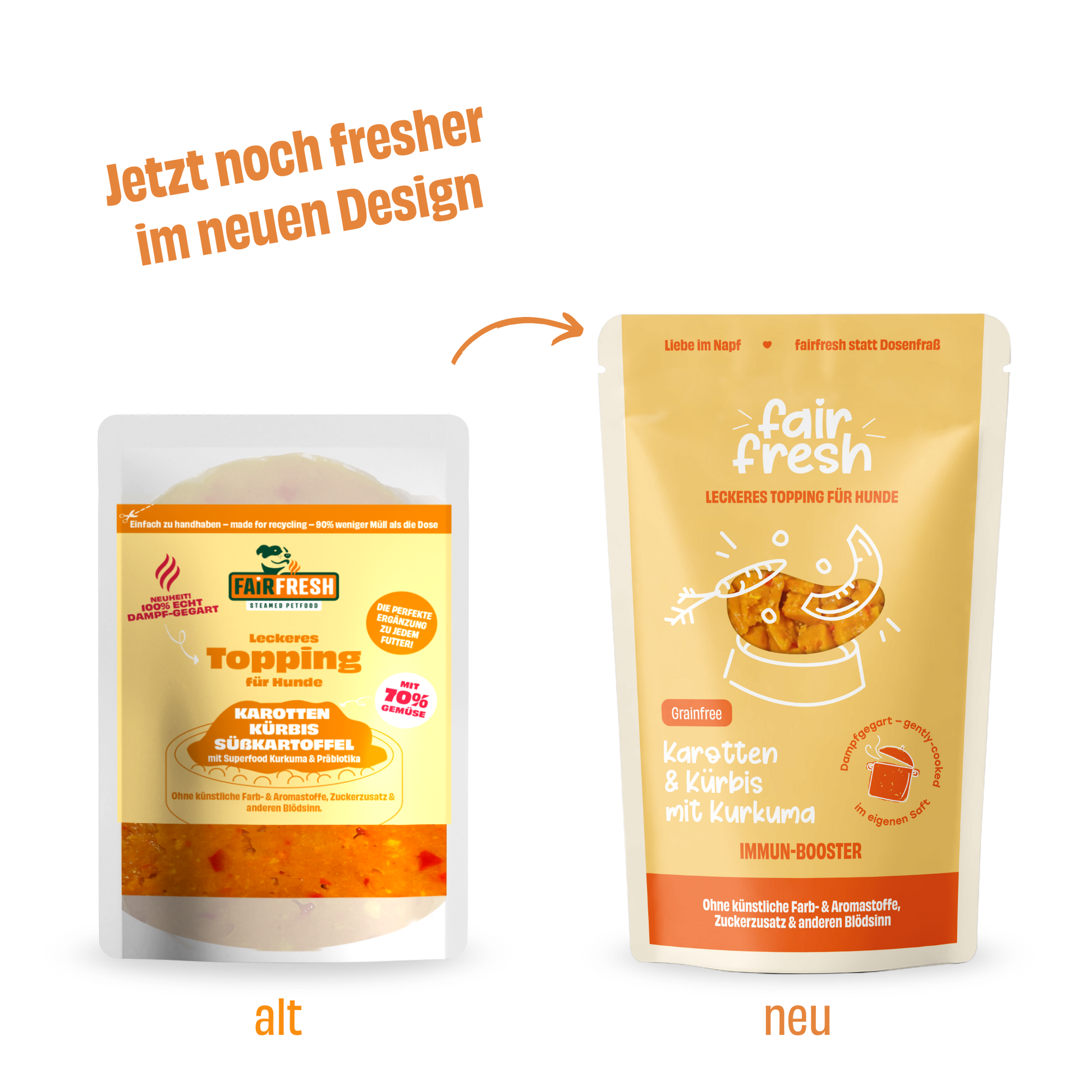 Hier kommt das FAIRFRESH Topping für Hunde mit Karotten, Kürbis und Süsskartoffel.