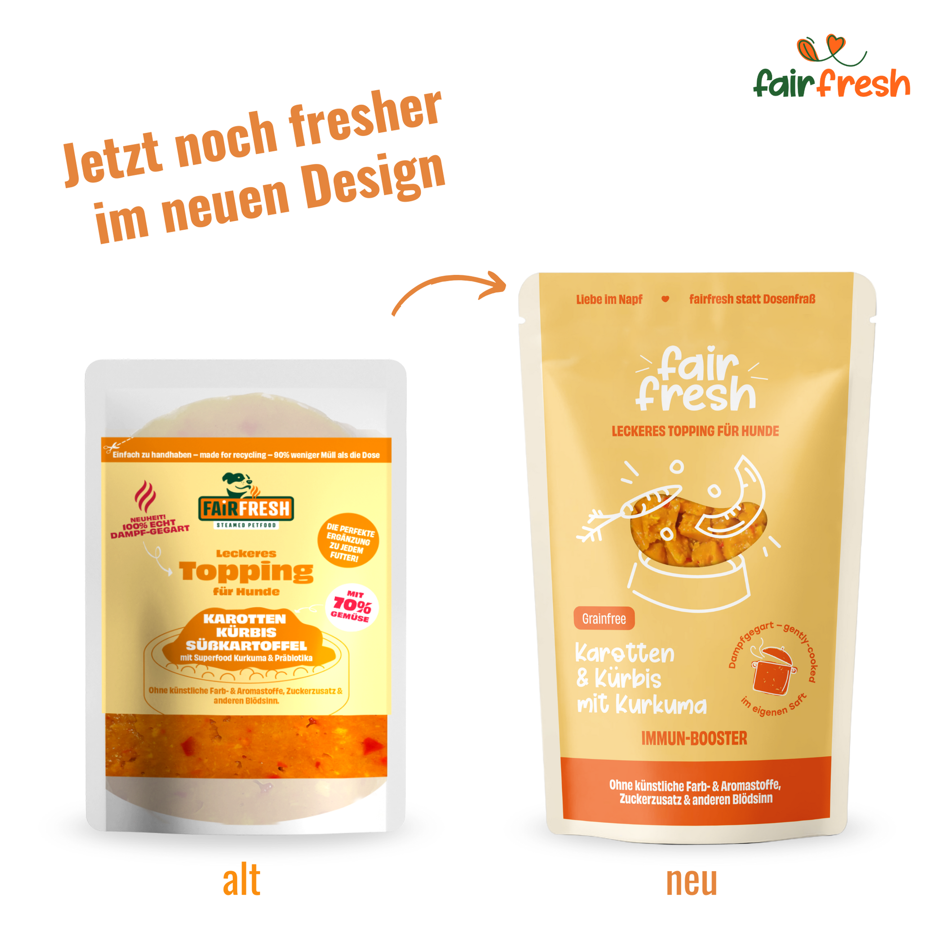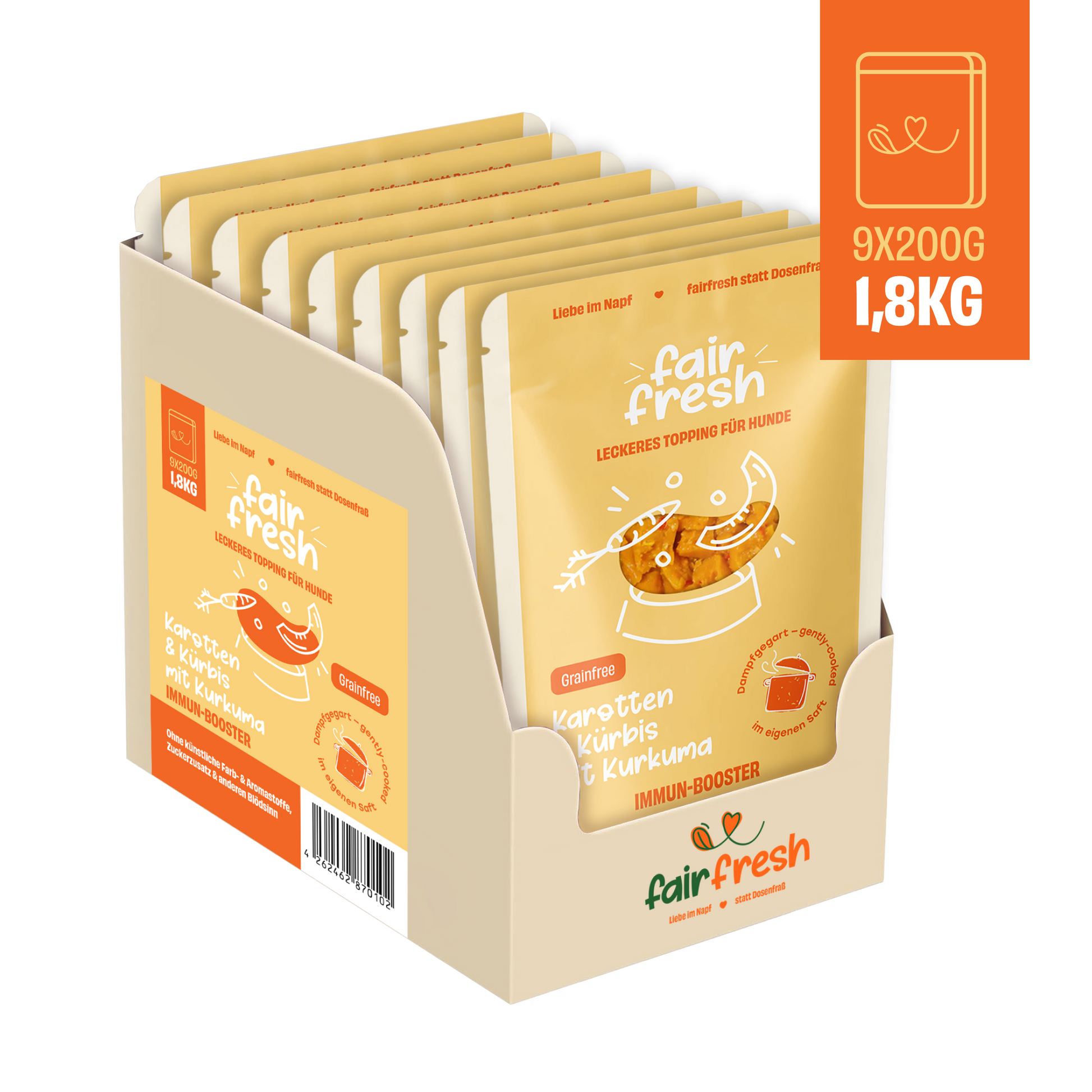 Das gelbe Gemüsetopping bringt Farbe, Abwechslung und richtig gute Zutaten ins Futter deines Hundes. Saftige Karotten und aromatischer Kürbis treffen auf Süßkartoffel, Sanddorn und eine feine Prise Kurkuma: ein echter Immun-Booster für den Alltag.