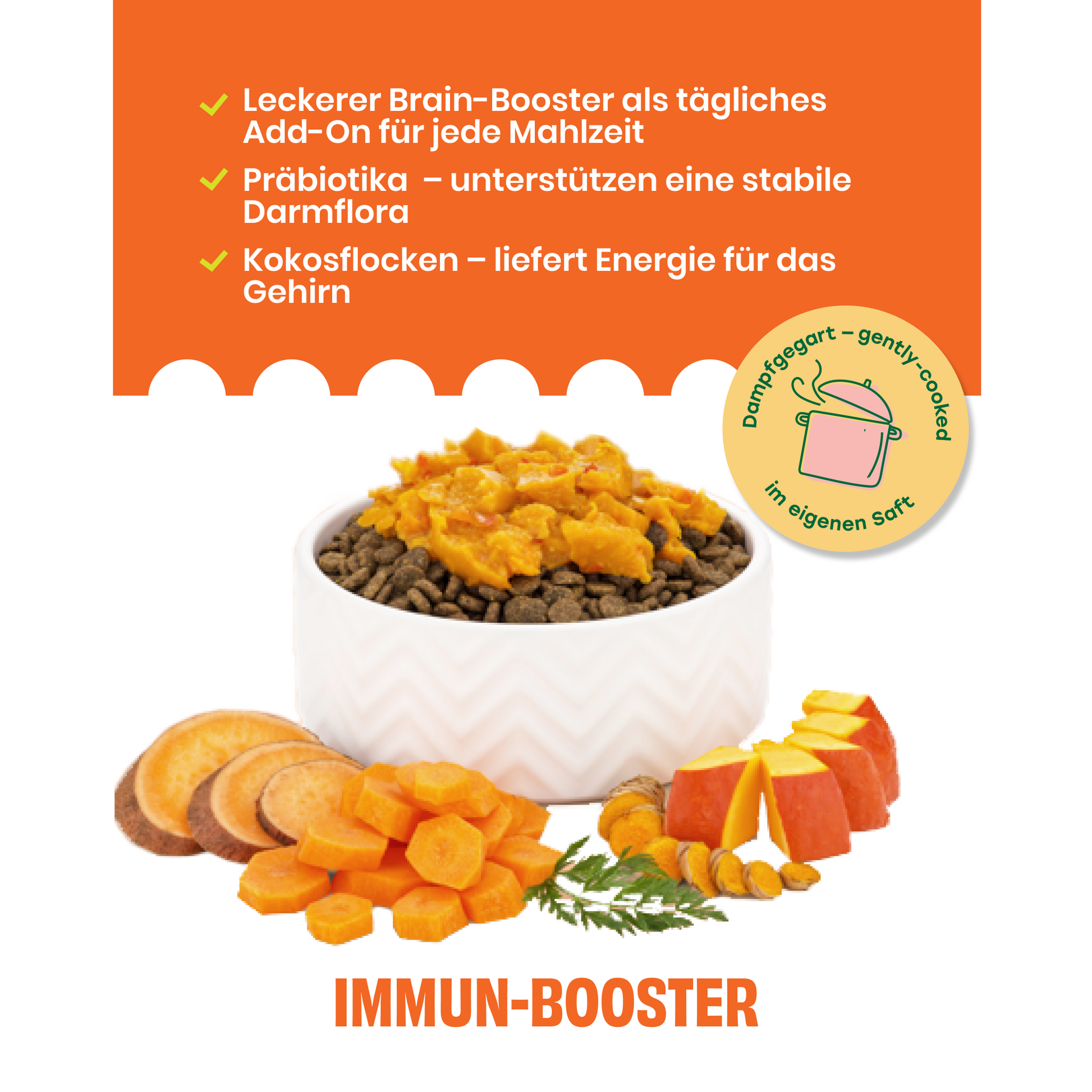 Dank unserer besonderen Dampfgarung überzeugt das Topping nicht nur optisch und mit einem angenehm milden Geruch – auch Konsistenz und Struktur sind perfekt abgestimmt. Ob als Add-on für Trockenfutter, pur gefüttert oder als Basis für selbstgemachte Hundesnacks: Hiermit machst du jede Mahlzeit abwechslungsreicher und unterstützt das Immunsystem deines Hundes auf natürliche Weise.